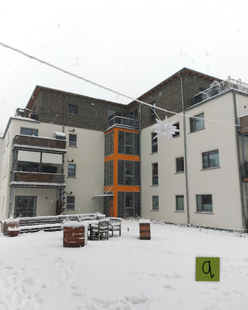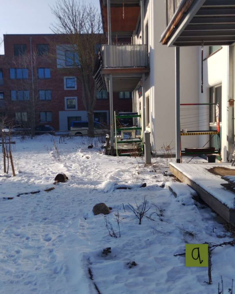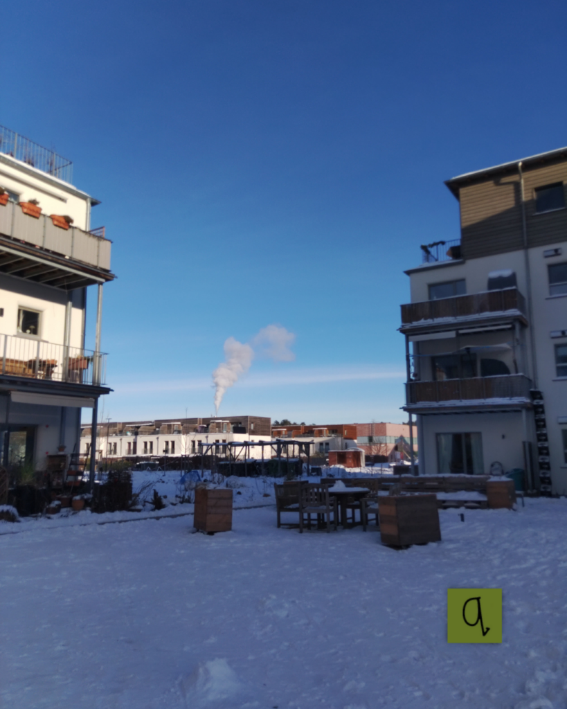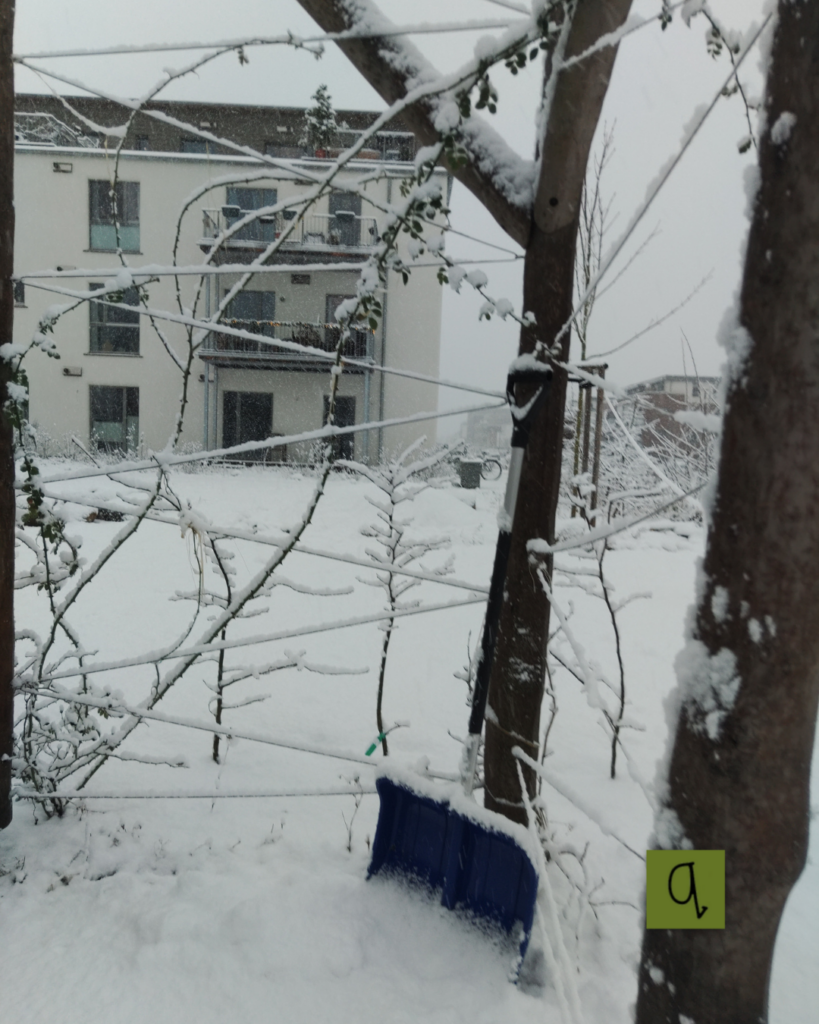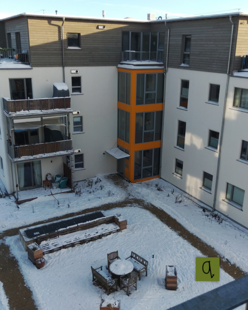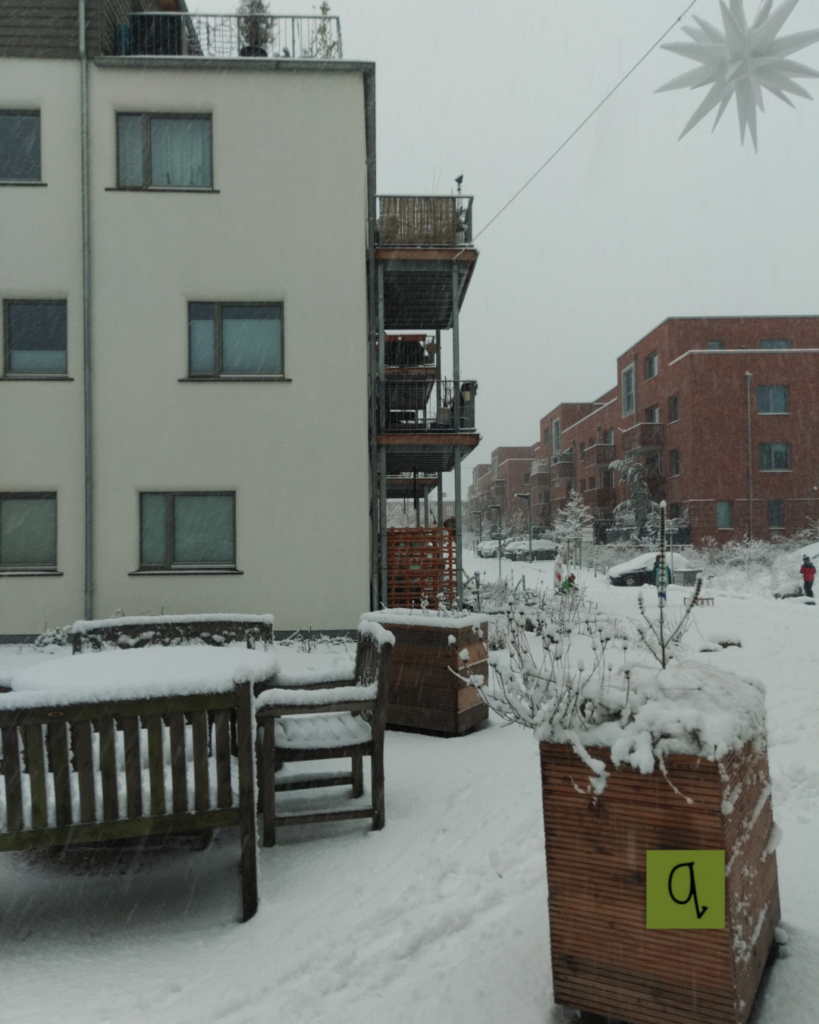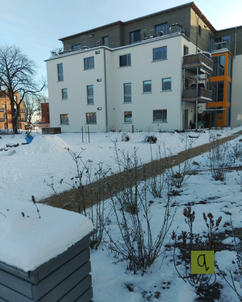 Gleichzeitig zeigte sich wieder eine Besonderheit unseres Wohnumfelds: Wir leben im Baugebiet – und hier gibt es (noch) keinen Winterdienst. So wurde der Weg zum Einkaufen, zur Arbeit, zur Schule oder in die Kita für manche zur kleinen Schlitterparty. Das ein oder andere Fahrrad blieb lieber in der Tiefgarage stehen oder wurde ein Stück geschoben, bis das Hanseviertel Ost überwunden war. Autofahrer:innen hingegen wussten die Tiefgarage zu schätzen – auch wenn selbst dort Schnee lag, denn unser Lüftungsschacht ist offen und lässt den Winter einziehen.